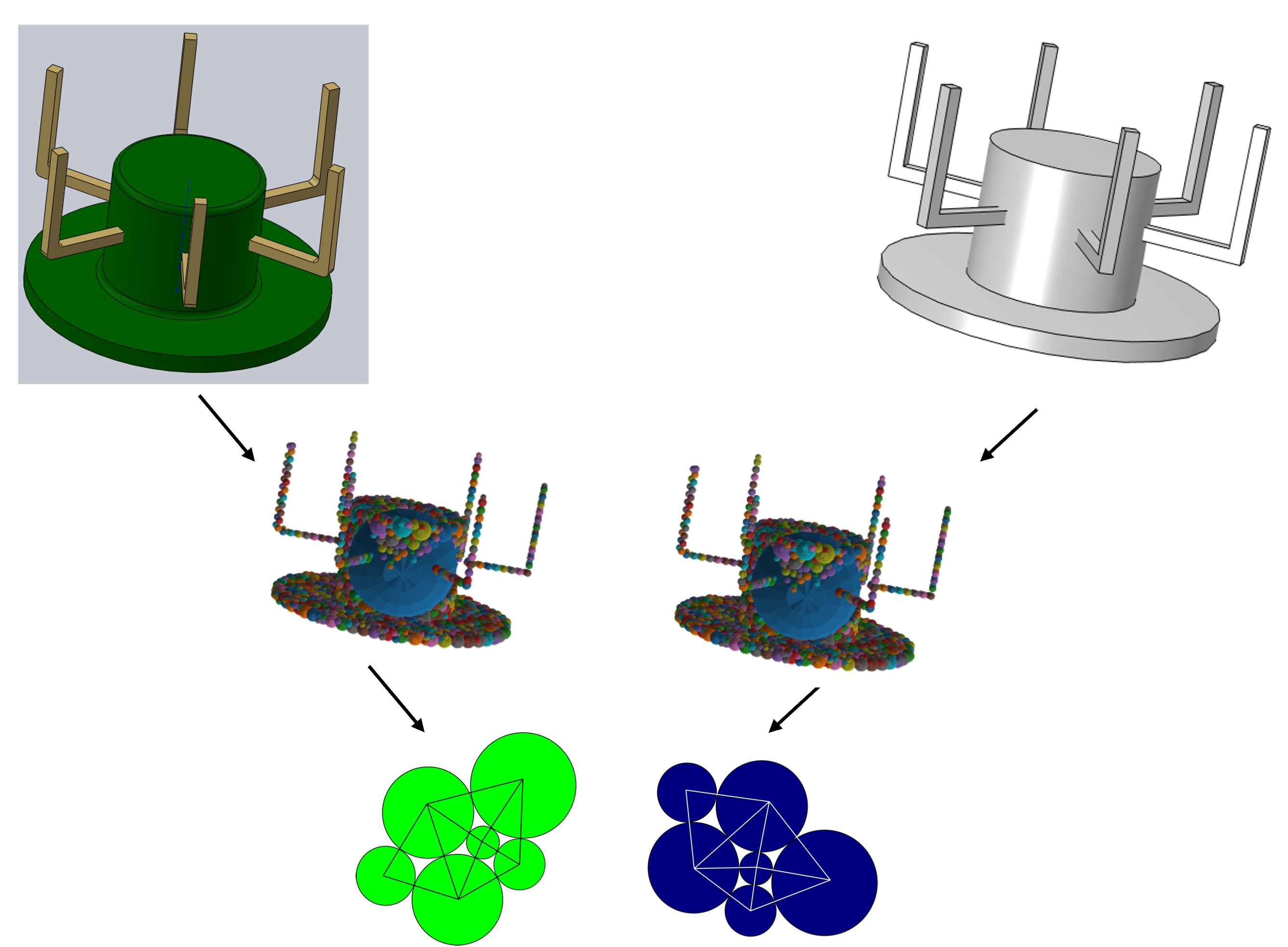 We introduce a novel geometric representation called Maximal Disjoint Ball Decomposition (MDBD), which serves as a unique sphere packing approach applicable to any valid geometric representation of a given shape. As illustrated in the image below, we can employ MDBD as a proxy representation to assess whether two geometric models, represented using different methods, possess identical shapes.